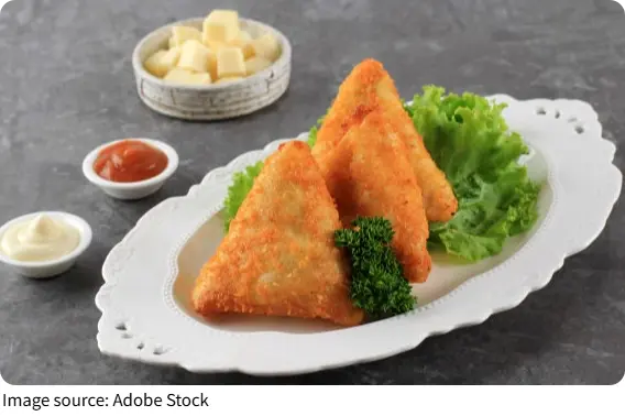 Imagine thin, delicate crepes folded into neat triangle shapes, filled with a savory mix of corn, carrots, and green beans. Served on a crisp white plate with melted cheese, creamy mayonnaise, and a kick of spicy chili sauce, it’s a snack that hits all the right notes and is sure to impress your friends.