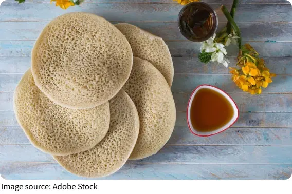 Baghrir can be enjoyed warm and sweetened with a drizzle of melted butter and honey. They’re also tasty with fruit spreads or soft cheese for a twist.
