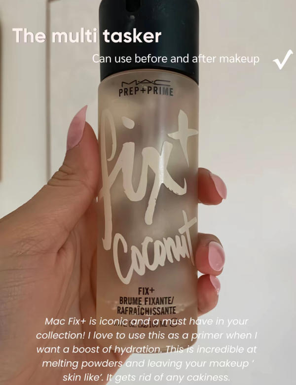 A staple in many makeup kits, MAC-Fix+ works both as a primer and finishing spray. The coconut-scented version is especially refreshing, though unscented options are available. It’s perfect for adding hydration to dry skin or giving your makeup a subtle boost. This spray is a must-have for a dewy, fresh look and is easy to reach for anytime during the day.