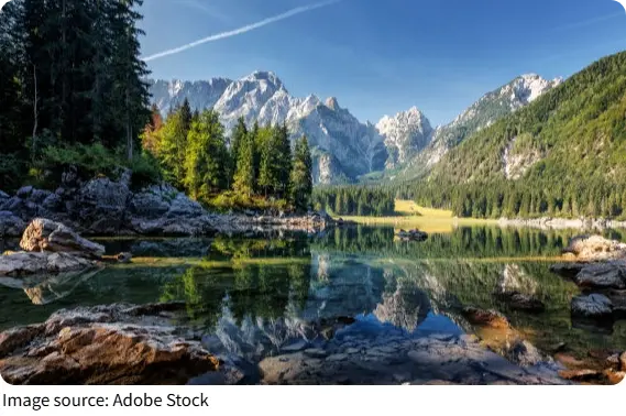 • Autumn: warm tones spread across forests and reflected water surfaces